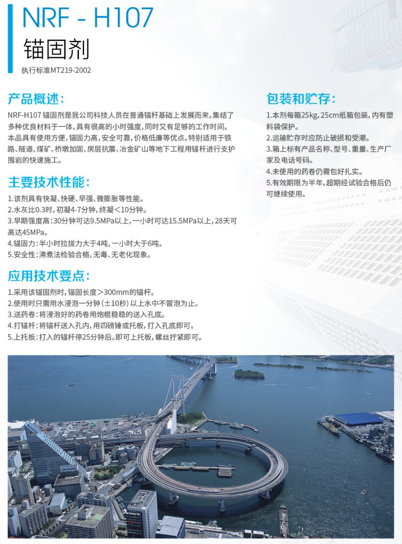 NRF-H107锚固剂是我公司科技人员在普通锚杆基础上发展而来。集结了多种优良材料于一体,具有很高的小时强度,同时又有足够的工作时间。本品具有使用方便,锚固力高,安全可靠,价格低廉等优点。特别适用于铁路、隧道、煤矿、桥墩加固、房层抗震、冶金矿山等地下工程用铺杆进行支护围岩的快速施工。
